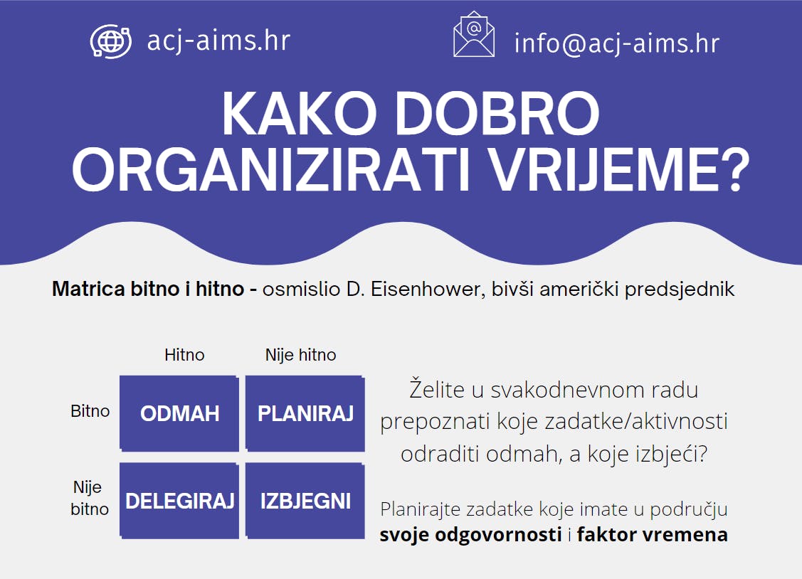 U ovom tekstu ću vam ukratko pojasniti kako bolje organizirati svoje vrijeme primjenom modela bitno i hitno koji je osmislio bivši američki predsjednik Eisenhower.